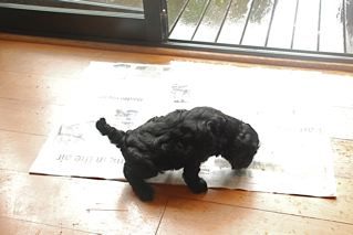 The best toilet habits are created by being outside from day 1. He’s been outside for the last few weeks and has good habits, toileting far away from his sleeping place. If he can’t be outside, use a pet loo / newspaper by the door. Clean regularly and introduce him to it each time he wakes up and after eating.
